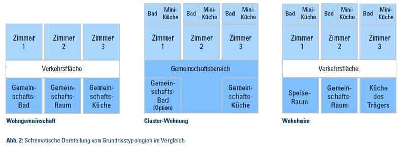 Cluster-Wohnungen kombinieren bekanntermaßen die Vorteile einer Kleinstwohnung mit denen einer Wohnge-meinschaft. Private Wohneinheiten sind mit gemeinschaftlich genutzten Räumen verbunden. Im Unterschied zur klassischen Wohngemeinschaft ist bei einer Cluster-Wohnung der Gemeinschaftsbereich deutlich größer und die privaten Wohneinheiten bestehen aus einem oder mehreren Zimmern und verfügen über ein eigenes Bad und ggf. einer (Tee-) Küche.